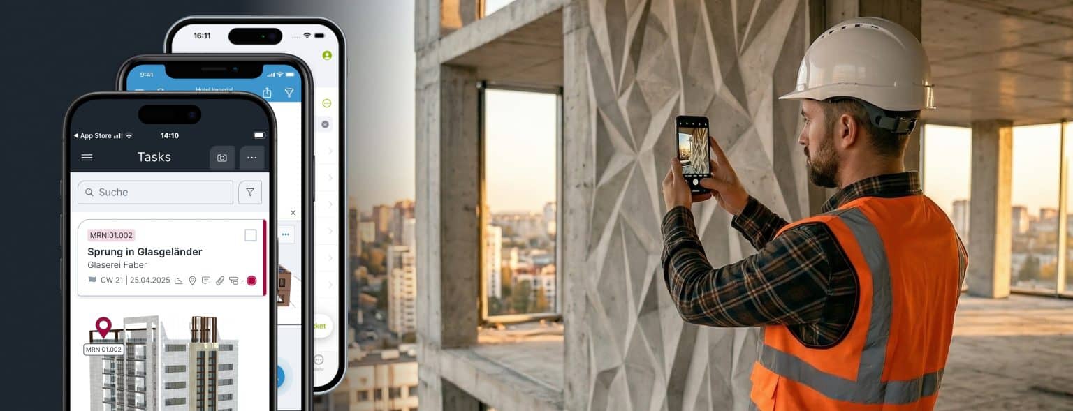 Fotos werden vor Ort mit dem Smartphone oder Tablet aufgenommen und sofort dem entsprechenden Projekt, Protokolleintrag oder Bautagebucheintrag zugeordnet – ohne manuelle Nacharbeit im Büro.