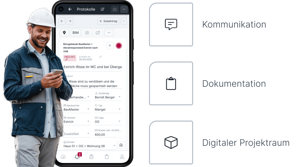 LetsBuild ist gut für komplexe Großprojekte geeignet, erfordert jedoch eine steile Lernkurve. Auch der Wechsel zwischen zwei separaten Apps erschwert die Bedienung. Wenn es um den praktischen Baualltag geht – schnelles Mängelmanagement, automatische Protokollfortschreibung, rechtssichere Dokumentation oder die Einbindung von Subunternehmern ohne Registrierung – bildet die Komplettlösung BauMaster eine durchdachte Alternative.